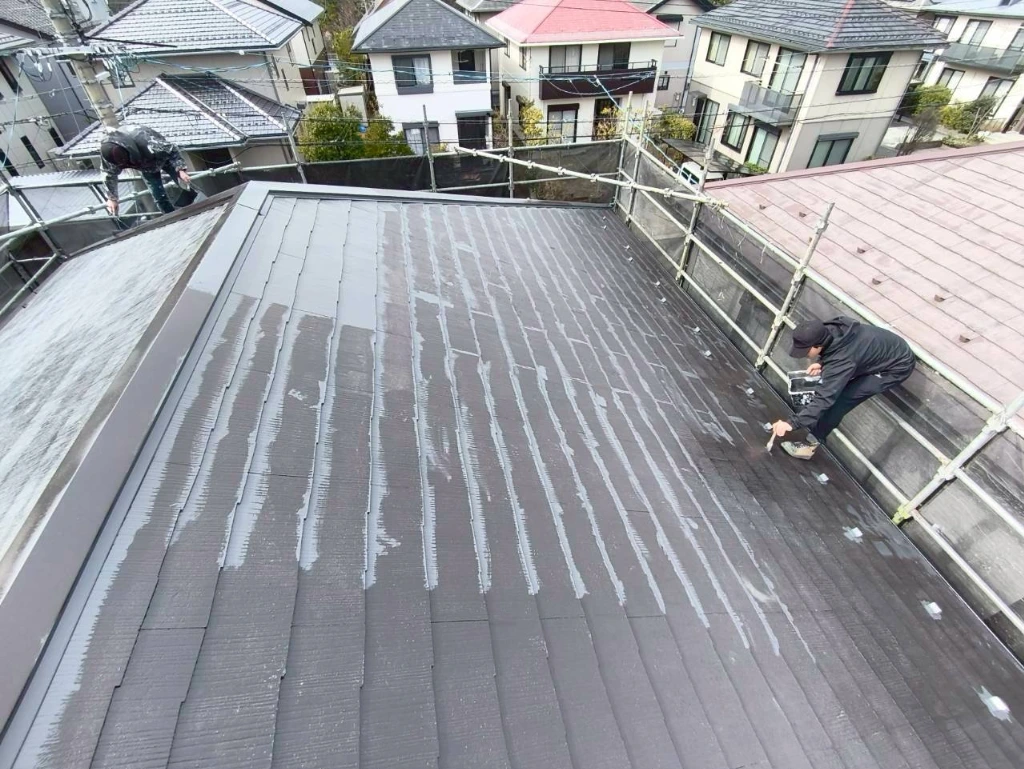 写真はスレート屋根の塗装工事で行っている上塗り1回目(中塗り)作業の様子です。
