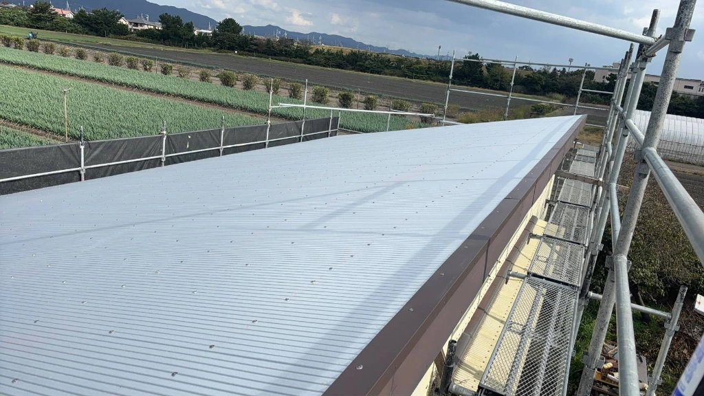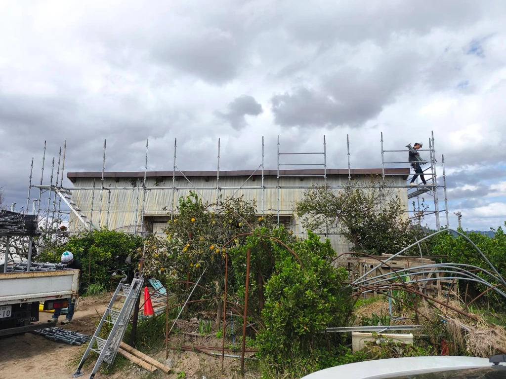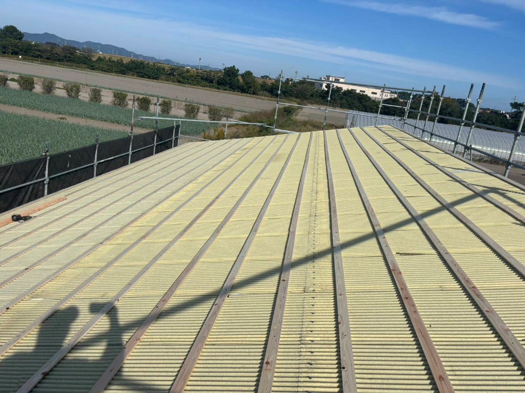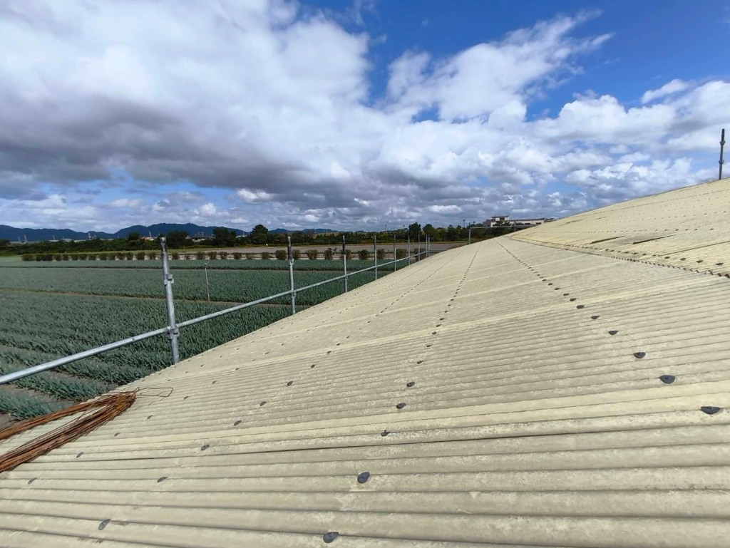 長年、農業を支えてきた倉庫の屋根。 紫外線や潮風の影響で、樹脂製の波板は時間とともに白く濁り、強度が落ちてしまいます。