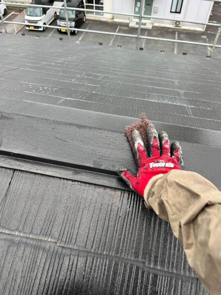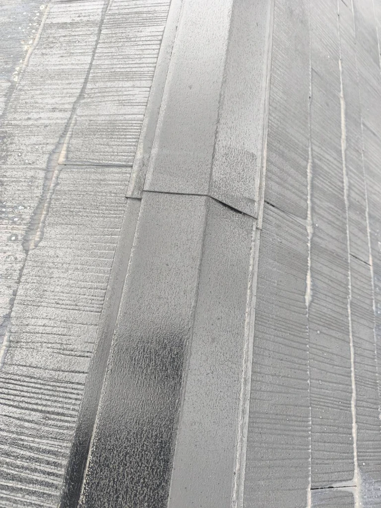 アパートの外壁塗装に合わせて、スレート屋根の板金部(棟板金・ケラバ・水切り)の塗装工事を行いました。 こちらの現場のスレート屋根は数年前に一度塗装されていますが、細部を確認すると、前回の施工における**「下地処理(ケレン)」の不足**が顕著に見られました。