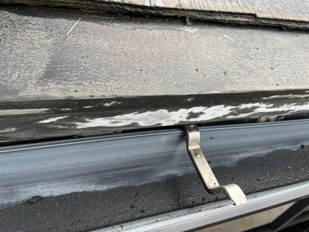 スレート屋根の板金部分を確認したところ、驚いたことに前回の塗装業者がサビを落とさず(ケレンせず)、そのまま上から塗装していました。 写真1枚目のように表面がザラザラしており、これでは塗料が密着せず、すぐにサビが再発してしまいます。
