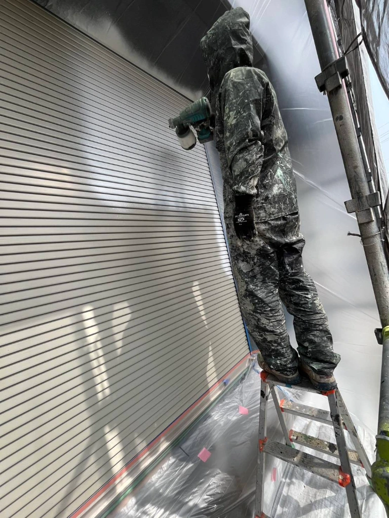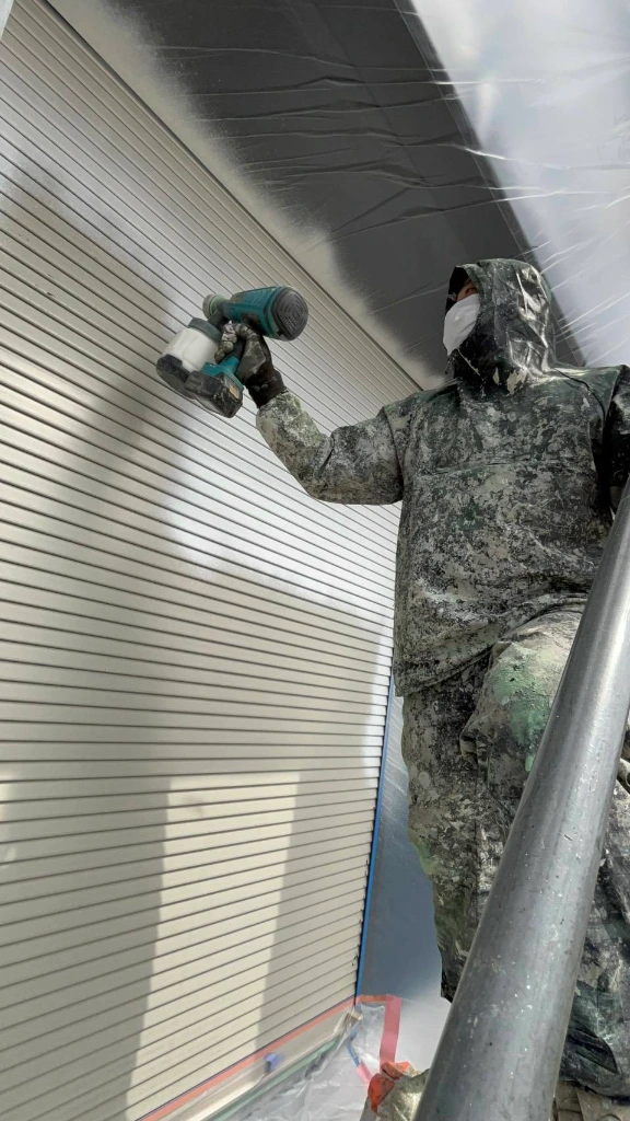 霧状の塗料を吹き付けることで、ローラー跡のない、まるで新品に取り替えたかのような滑らかな質感に仕上がります。特に戸建て住宅の「顔」となる車庫や窓シャッターにおいて、この仕上がりの差は歴然です。