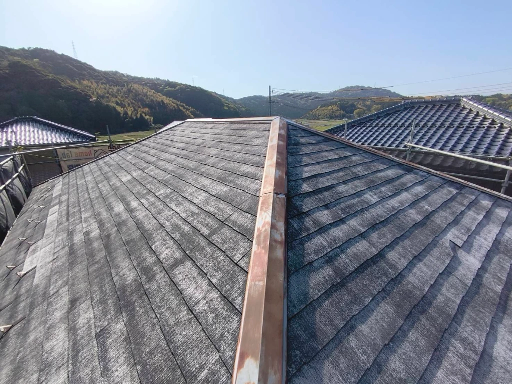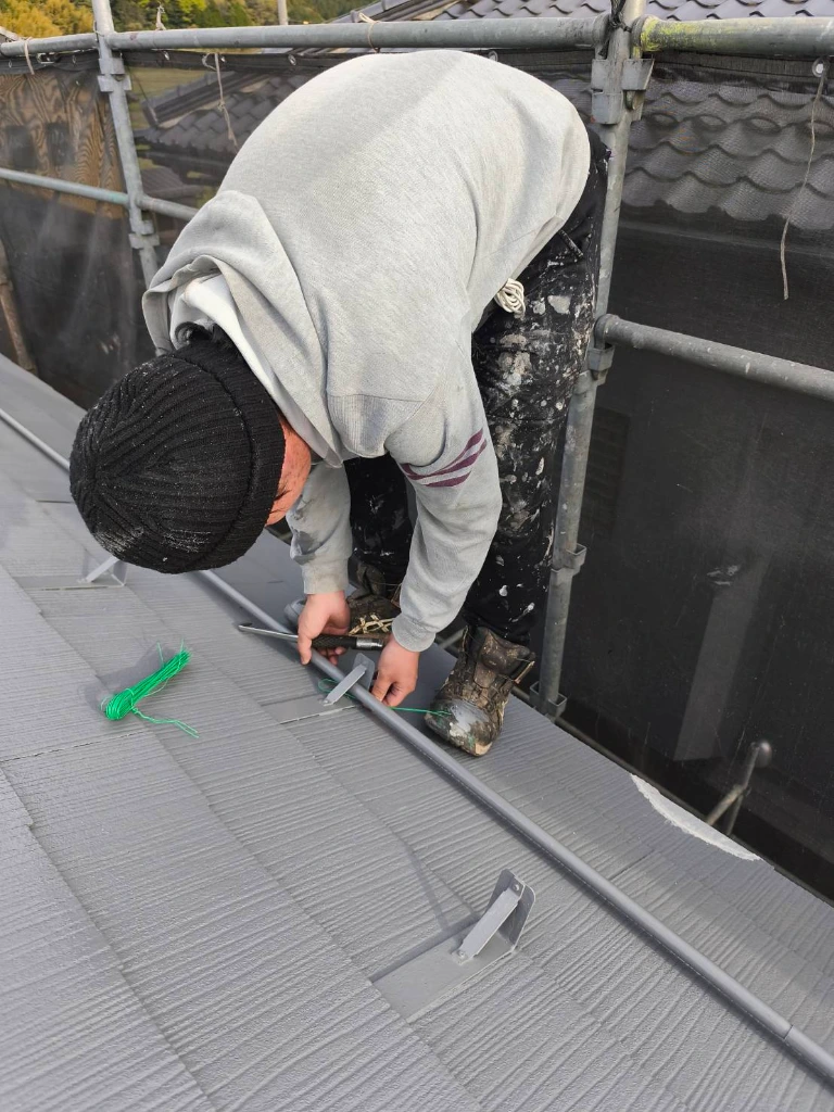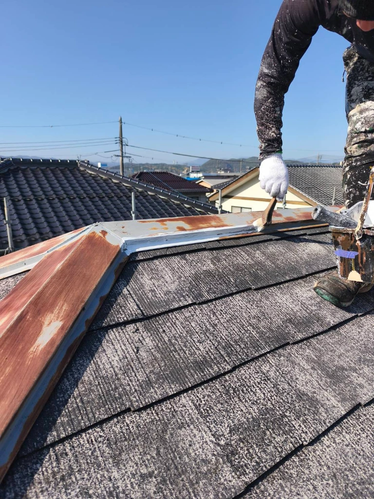 鉄部の錆止め: 棟板金などの金属部分は、下地に錆止めをしっかり塗布して耐久性を高めています。
