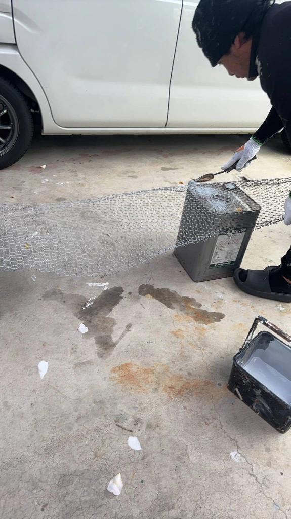 雪持ちネット: ネット部分は工場に持ち込み、ローラーで丁寧に塗り込みました。 網目までしっかりと塗料を乗せることで、耐久性を向上させています。