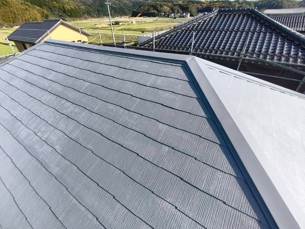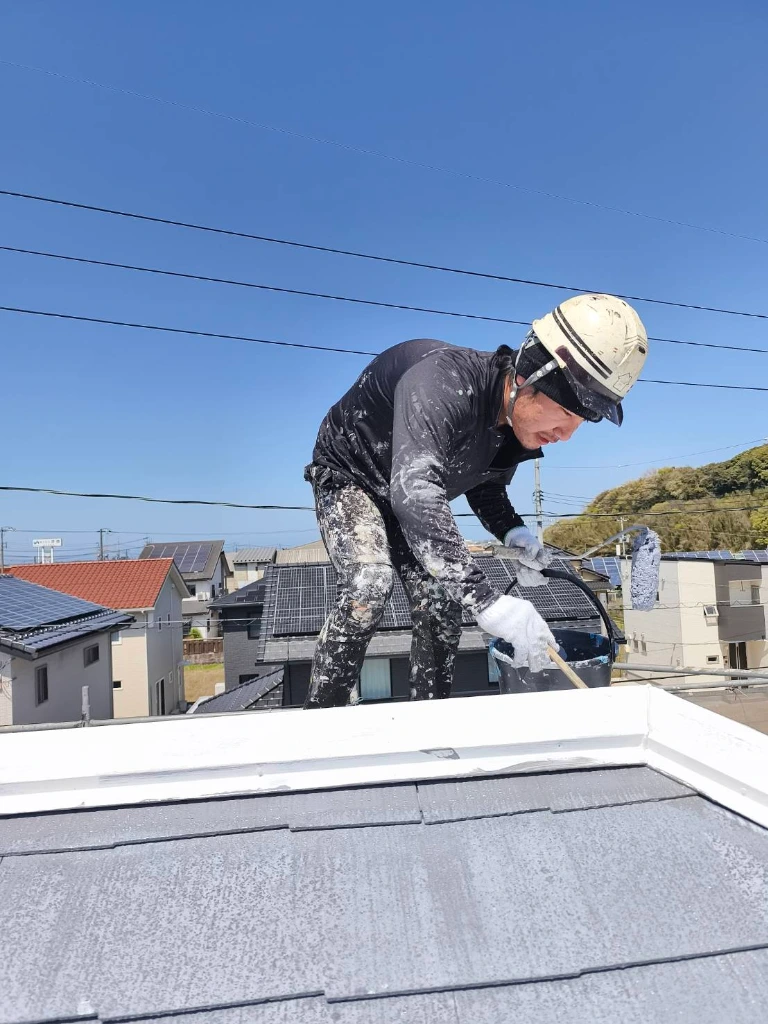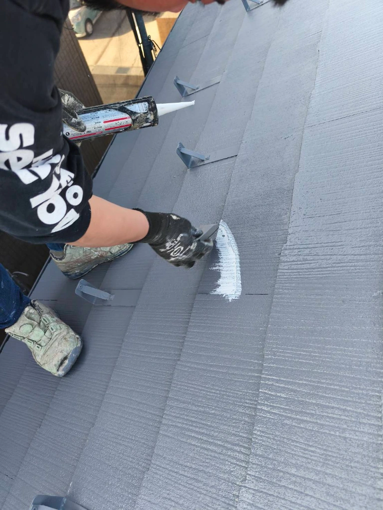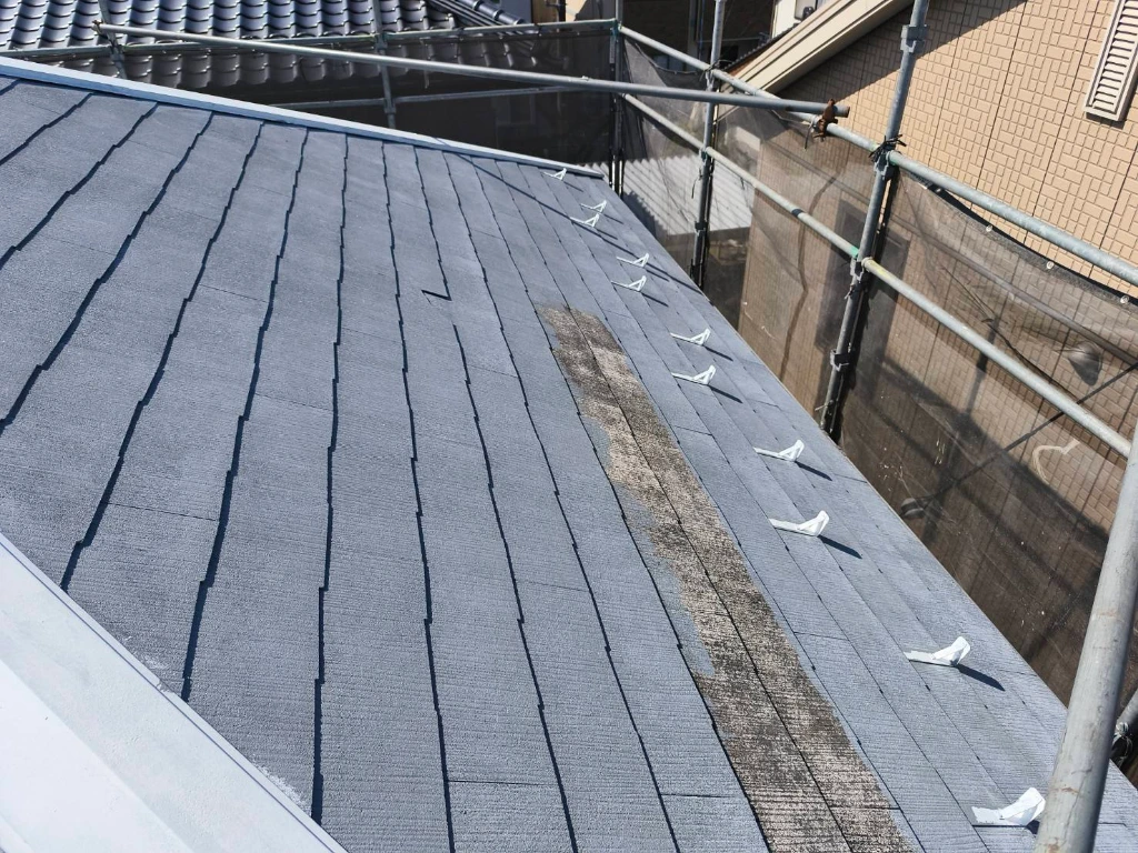屋根塗装で欠かせないのが「縁切り」です。今回はタスペーサーを使用せず、皮スキとカッターを用いて手作業で縁切りを行いました。手間はかかりますが、屋根材の隙間を確実に確保することで、雨漏りや内部の腐食を未然に防ぎます。