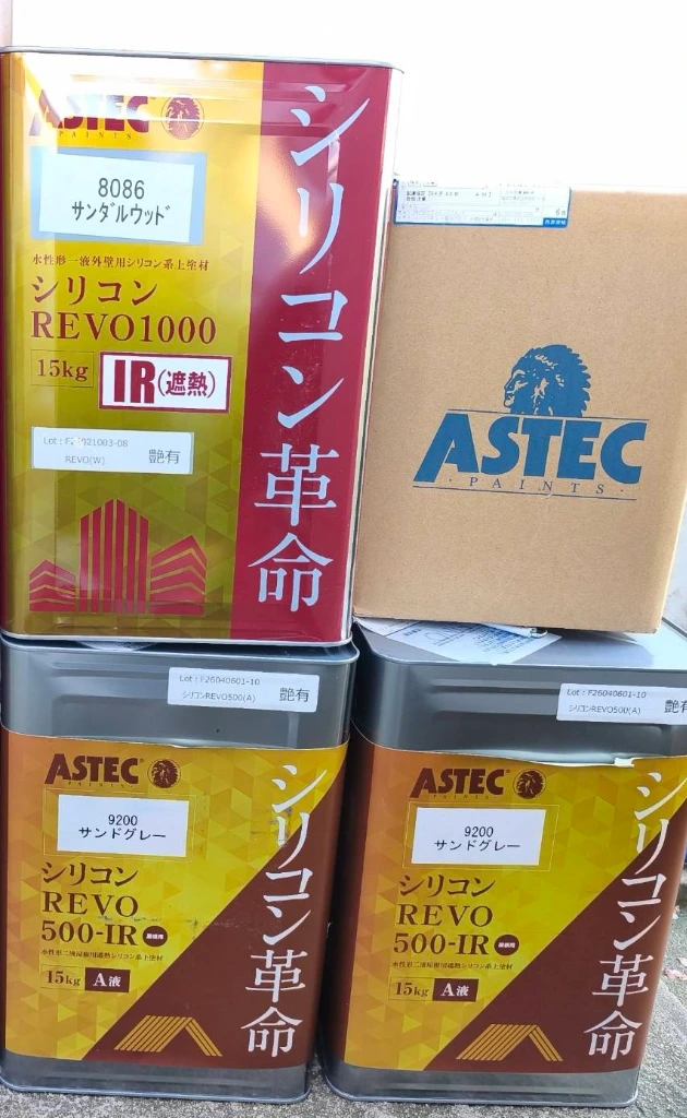 今回採用したのは、期待の新製品**「シリコンREVO500-IR(2液水性遮熱塗料)」**です。 実際に施工して実感したのは、硬化乾燥後の塗膜の強さです。足跡もつかないほど強固な塗膜が形成され、非常に長持ちしそうな手応えを感じました。高い遮熱機能により、夏の室温上昇もしっかり抑えてくれます。